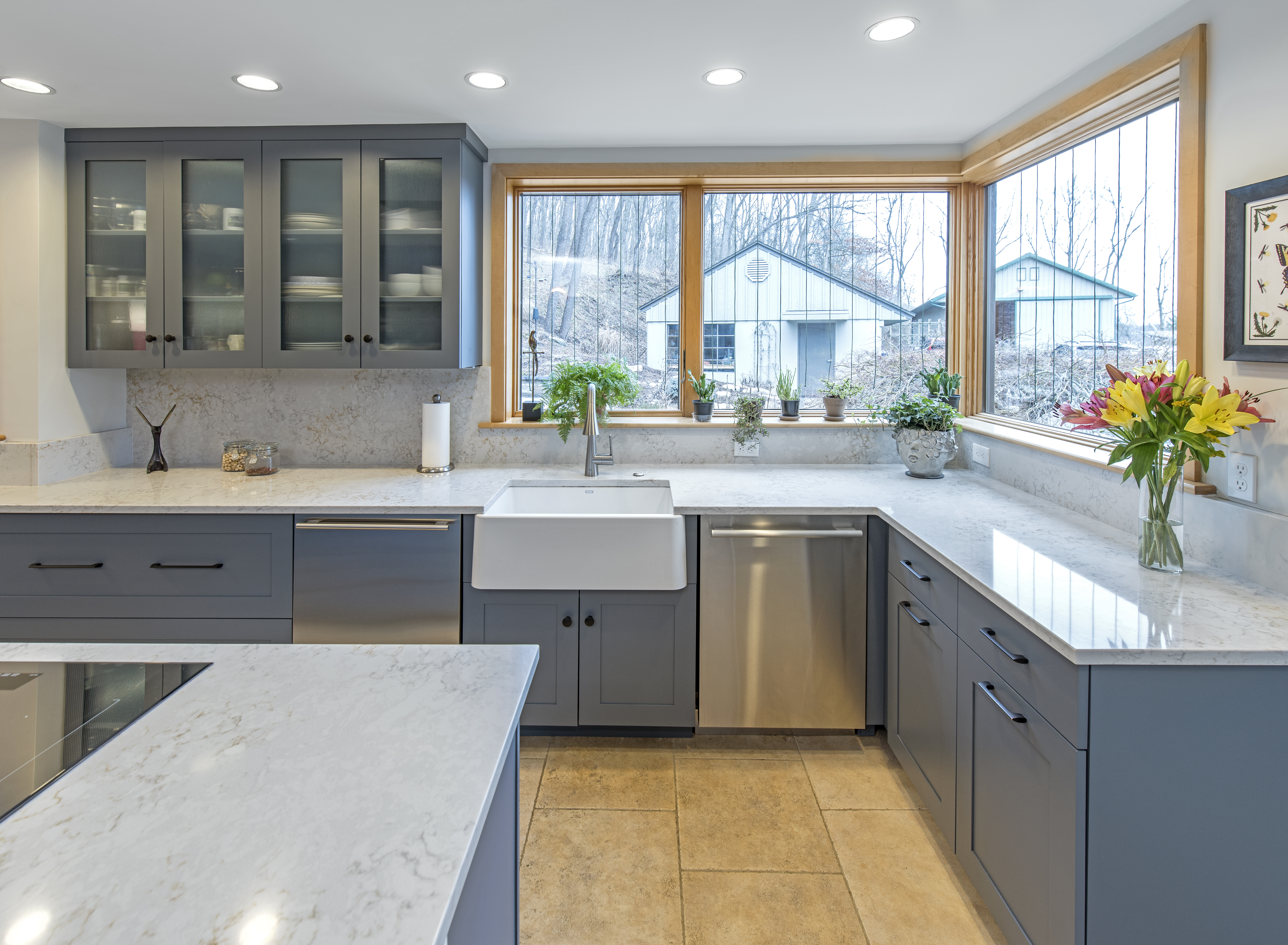 For this remodeling project, the homeowners loved the beautiful forest view from their kitchen. As with many Penn Contractors clients, this was one of several stand-out features in the existing home that initially attracted the owners, and the new design needed to honor those features. The homeowner wanted to enhance the view while keeping the original windows and tile floor. Our design approach included using the forest backdrop and neutral floor and window frame tones as a base while creating better flow in the kitchen and modernizing the space.